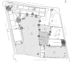 Soluciones: La intervención resuelve los accesos a las aulas de infantil y primaria y la evacuación de aguas pluviales. Un camino amarillo facilita la formación de las filas escolares, mientras que una gran alfombra roja ralentiza los flujos de niños, facilita la accesibilidad a las aulas y canaliza las aguas a un sumidero de gran dimensión que funciona también como felpudo de entrada a los espacios interiores bajo la sombra de los limoneros.