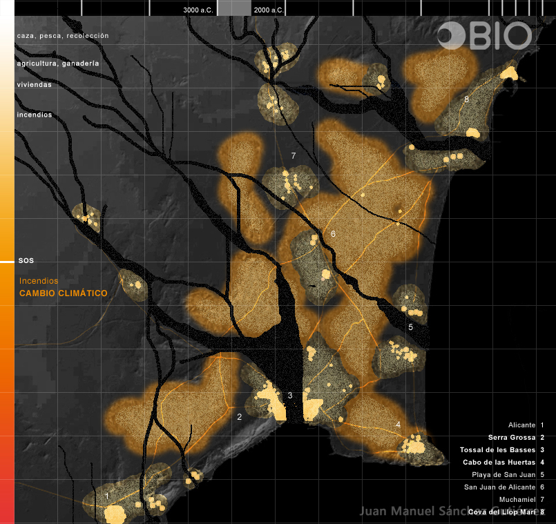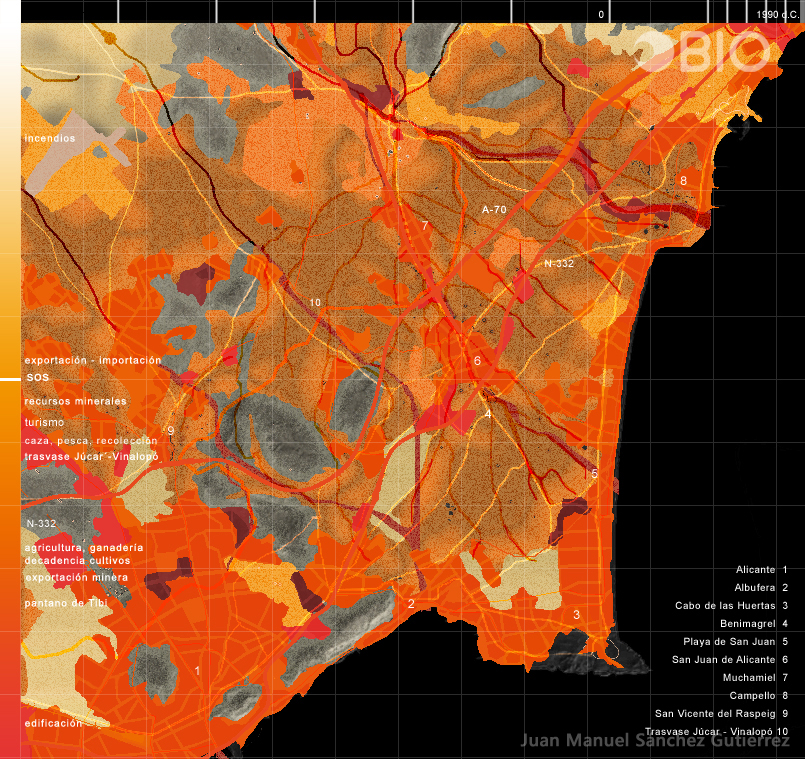 La zona de la antigua Huerta de Alicante, prácticamente desaparecida, goza de un clima “paradisíaco” muy apreciado por los foráneos a la tierra, entre los cuales me incluyo. Muchas veces cuando me encuentro en la artificial playa de Muchavista dejó de mirar por un instante al hipnotizante Mar Mediterráneo para mirar a las imponentes y desconocidas montañas que nos cobijan de los vientos fríos y de las nubes cargadas de lluvia provenientes del interior de la Península, y me imagino cómo sería la zona si no hubiera tenido ninguna transformación artificial. No me imagino otra cosa que no sea un paraíso selvático con telón de fondo montañoso, en donde abundaban los recursos naturales propiciando el asentamiento de los primeros humanos que pasaron por ahí. Posteriormente se sucedieron diferentes civilizaciones hasta nuestra era postindustrial cada vez más ajena al lugar real y más centrada en un mundo virtual. Ese desenraizamiento progresivo al lugar, exponencialmente evidenciado durante los últimos años, ha causado un impacto ambiental considerable en la zona.